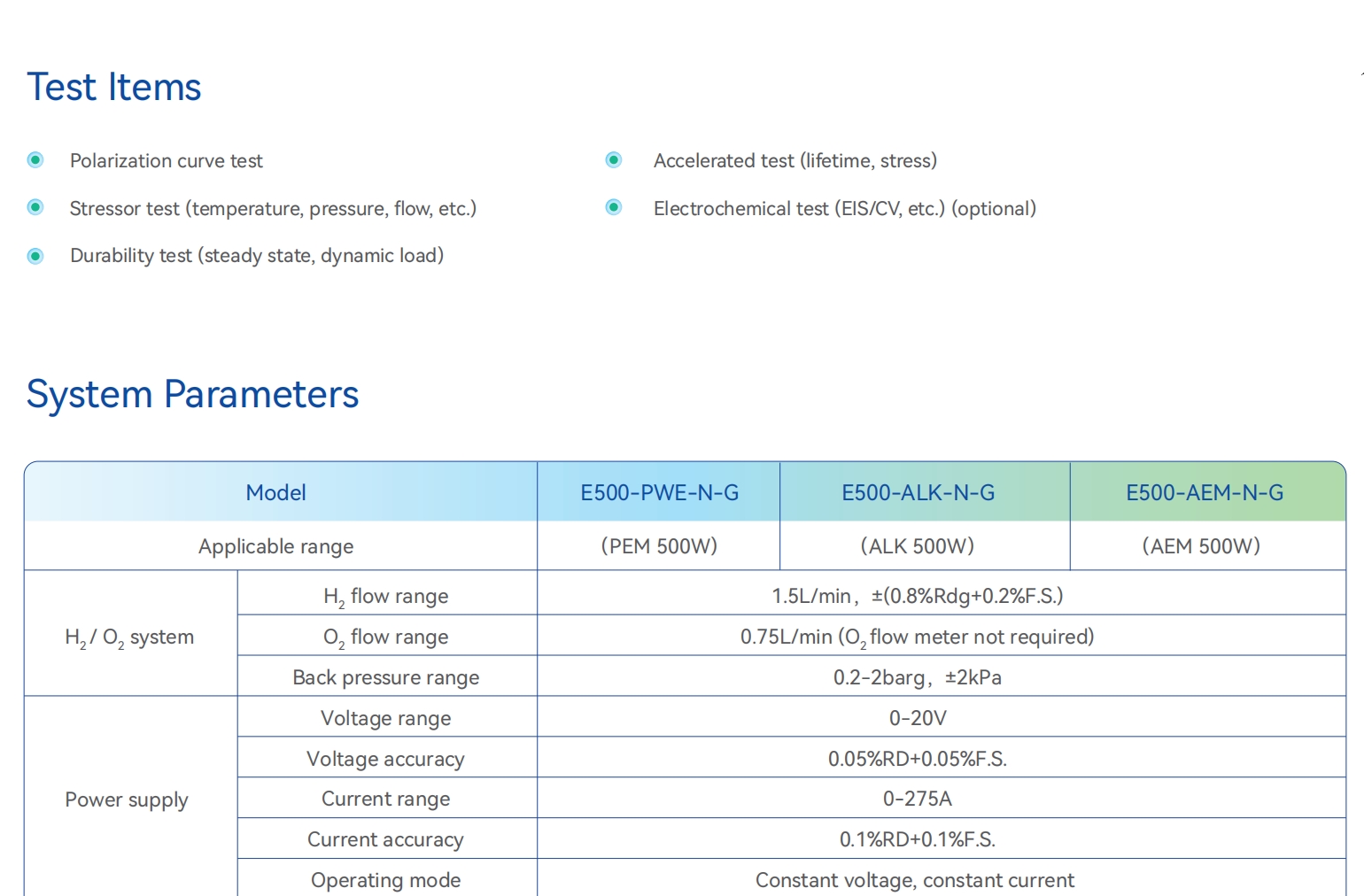 The E500 Series Single-cell Test System is an accurate and reliable low-pressure platform for PEM, ALK, and AEM electrolyzer single-cell and material-level testing up to 500 W.