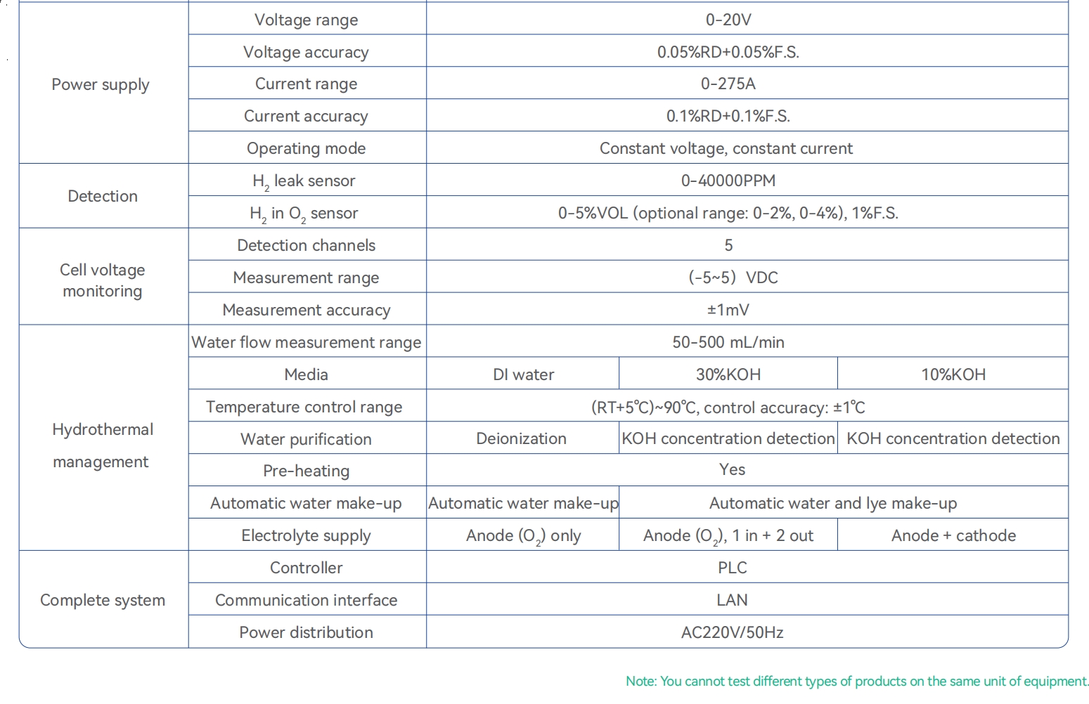 - Hardware protections: hydrogen leakage, temperature abnormality, manual emergency stop, emergency venting H2 in O2 concentration, and independent safety unit