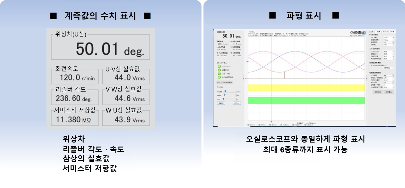 · 리졸버 위상, 각도·속도, 서미스터 저항값, 삼상 실효값 등 다양한 계측