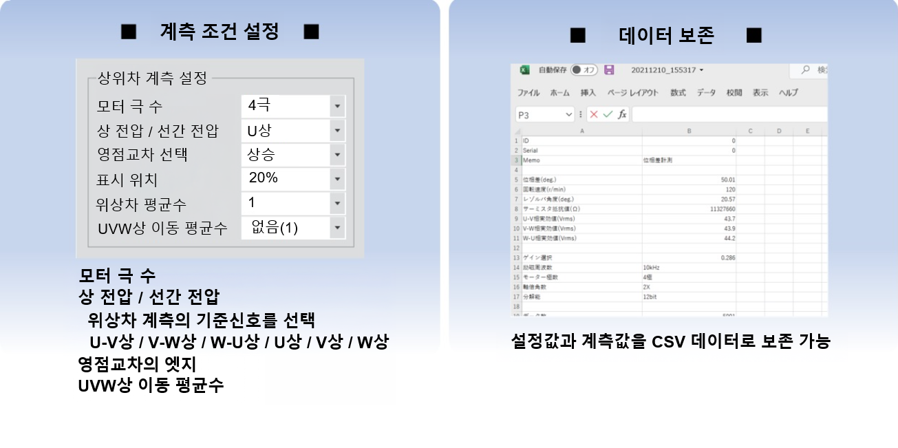 · 계측 조건과 계측을 CSV 데이터로 저장, 화면은 하드카피 가능