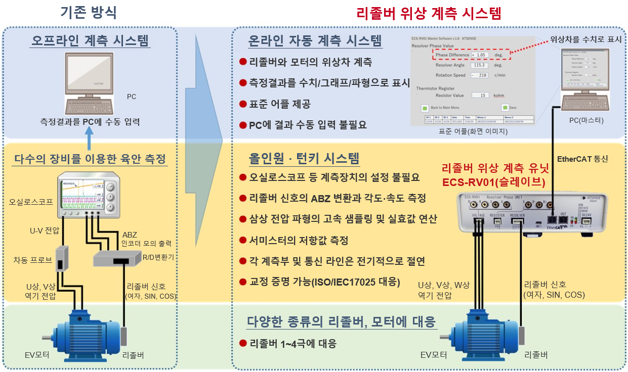 아토센스社의 ECS-RV01/ECM-RV11는, EV 모터의 삼상 역기전력과 리졸버 신호를 직접 입력하여 위상차 계측 및 데이터 수집을 합니다.